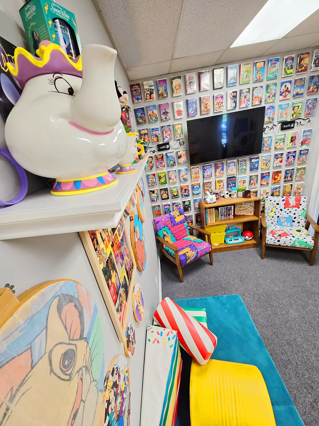 A kid’s lounge and waiting room — observable on baby monitors throughout the studio — invites caretakers to bring their children with them while getting their nails done. Kids are treated to educational toys, a Barbie dollhouse, and a wall of classic Disney VHS tapes to watch, still in their original plastic boxes.
