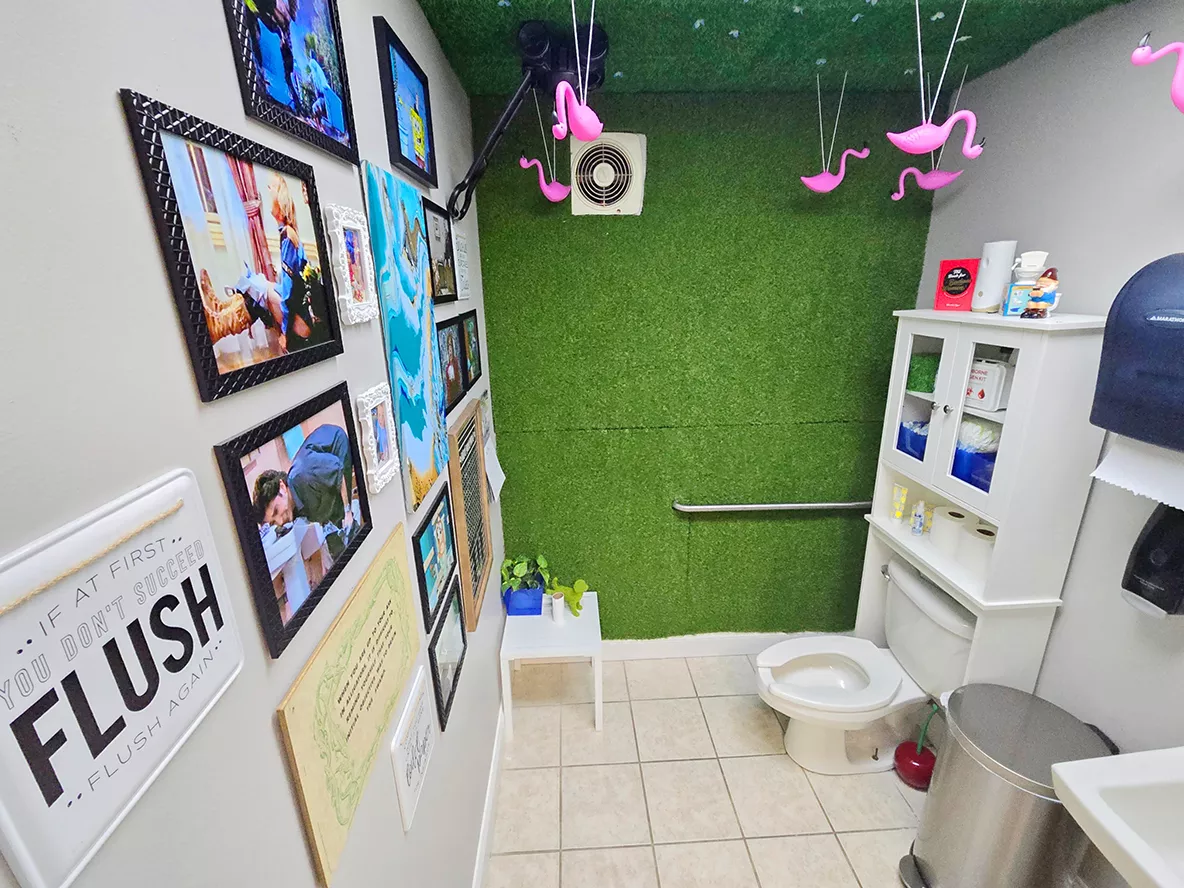 The family-friendliness even extends to the nail studio’s bathroom, which includes a collapsible changing table.