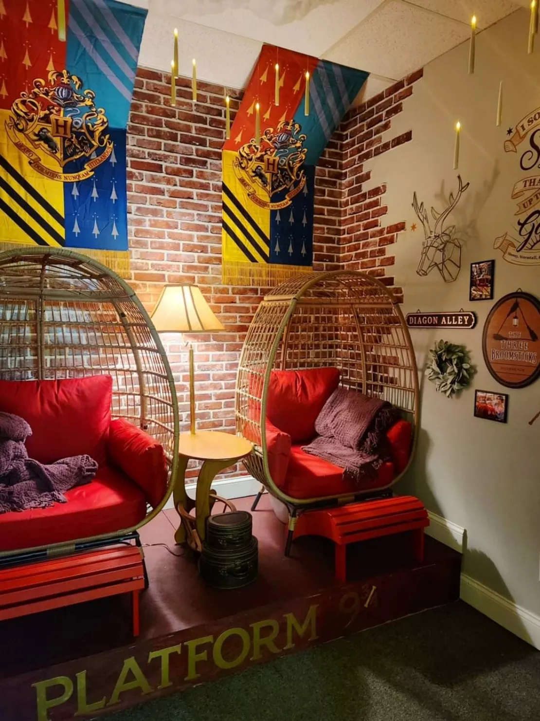 The room’s whimsical decor is inspired by Zimmerman’s own childhood visit to Cinderella’s Castle at Disney World. For its 25th anniversary in 1996, the castle was transformed into a giant pink birthday cake with faux icing, lollipops, and gumdrops, which inspired the studio lounge’s wall art and foam cake slice pillows.
