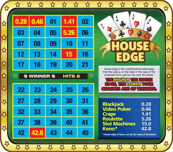 The house edge in keno is very close to the 50 percent house edge for other number-draw lottery games, according to Shackleford. Compared to casino-style games, according to Shackleford’s website, keno offers far and away the worst return on your wager: Blackjack has a house edge of .28 percent, video poker has an edge of .46 percent, and craps checks in at 1.41 percent. Even the games considered to have the worst house edge in a casino — roulette (5.2 percent) and slot machines (15 percent) — don’t come close to keno.