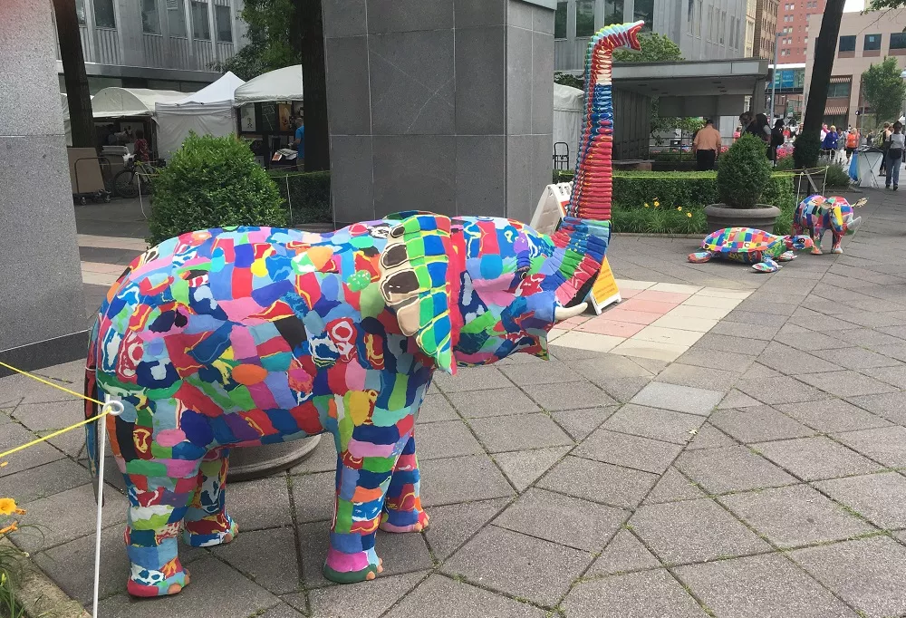 If you head to the Three Rivers Arts Festival (TRAF) this year, you might notice seven large, rainbow-colored animal sculptures in and around the Wyndham Lawn near Gateway Center. But the eye-catching public artworks aren’t made from marble or other traditional sculpting materials – they’re made from found flip-flops recovered from the beaches and waterways of Kenya.