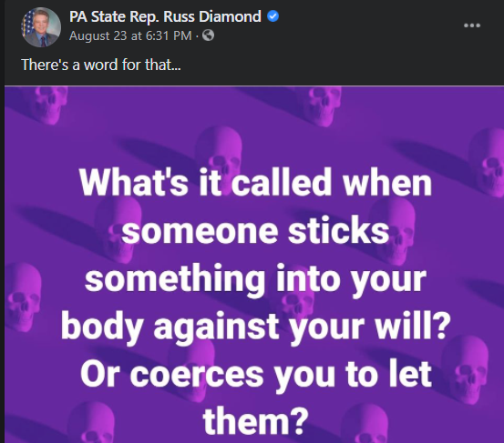 In an Aug. 23 post to his verified Facebook page, state Rep. Russ Diamond (R-Lebanon) wrote, “What’s it called when someone sticks something into your body against your will? Or coerces you to let them?:
