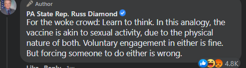 “For the woke crowd: Learn to think. In this analogy, the vaccine is akin to sexual activity, due to the physical nature of both. Voluntary engagement in either is fine. But forcing someone to do either is wrong.”