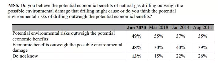 When voters were asked about this trade-off, more believed the environmental risks outweighed the economic benefits by a margin of 49%-38%. Those opinions have changed over time. Both in 2011 and 2014, more voters said economics benefits outweighed the environmental impacts. But in 2018 and 2020, more people believe the economic benefits don’t outweigh the environmental factors.