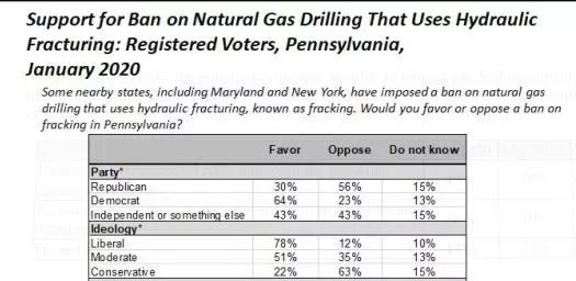 According to the poll, 48% of registered voters support a ban on fracking compared to 39% who oppose a ban. Support for a ban is split across partisan lines. Democrats favor a fracking ban 64%-23%, which Republicans oppose a ban. Only 30% of Republicans favor a ban, while 56% oppose. Independents are evenly split at 43%-43%. However, both self-described liberals and moderates in Pennsylvania support a ban, while conservatives oppose it.