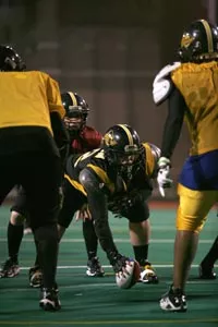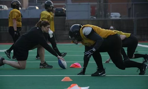 Imagine lining up across from the center, trying to focus on the ball and ignore the rain, the wind, the chill of early March. You try to remember your gap assignment as two months of coaching instruction buzzes through your head. Behind you, linebacker Tia Montgomery is hollering “Louie! Louie!” while quarterback Lisa Horton barks out signals across from you.