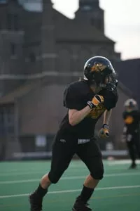 By 8:15 on a customarily cold, dreary February night, nearly all of the players are here, uniforms and gear in various degrees of readiness. The hallway outside the indoor practice field is full of sounds. The clack-clack of unbuckled shoulder pads, players straining to loosen tight muscles and tendons, trainers taping and counseling, and the clatter of plastic cleats on the hardwood of the hallway floor — all mingle with the usual chatter you’d find surrounding just about any locker room.
