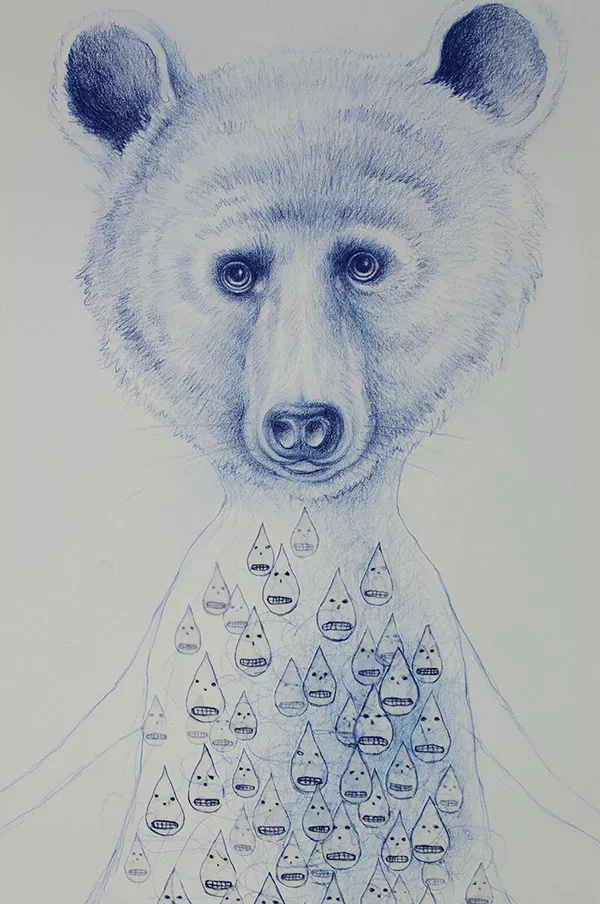 Bellan-Gillen’s voice is not predictable. Instead, it thrives on the juxtaposition of one archetype and the next, in a trance-like natural world full of what in her artist statement she calls “weird elegance,” and the subsequent play of ideas arising from the oddities. She draws the participant into her fantasies using the familiar, like dancing White Rabbits and the smiles of the Cheshire Cat, but then willfully throws us off the Wonderland train by introducing suggestive sea monsters in the next panel. It’s a wild ride the dreamer will feel like she’s taken before, but here slowed down to leave time for noticing every humorous tidbit and every fearful glance, while wandering through the disquieting layers of the subconscious.