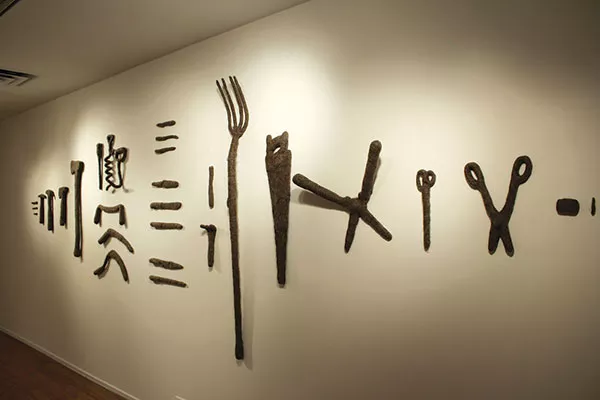 A fundamental aspect of Clayton’s approach to art is that, while she might alter things, she doesn’t generally make things beyond, say, the series of genial ink-on-paper “Typewriter Drawings.” But she’s not averse to having other people make things, soliciting content through crowdsourcing. For 2013’s “One Brown Shoe,” the ambitious project that is the exhibit’s centerpiece, Clayton had each partner in a married couple (though why “married,” I might ask) independently make a shoe out of any material. She stipulated only that the shoe be brown, a minimal dictum that was interpreted loosely. The parameters turned out to be just right, such that anyone could conjure the idea of “shoe” as the basis for creating an essentially sculptural form, which is also readily recognizable by the audience. The resulting display coheres through its shared subject, yet is incredibly varied and inventive. (One senses an artistic background among many though surely not all of the participants.) The project highlights the endless variety of human creativity while embodying the difference in perspective between any two people, including those in a close relationship.