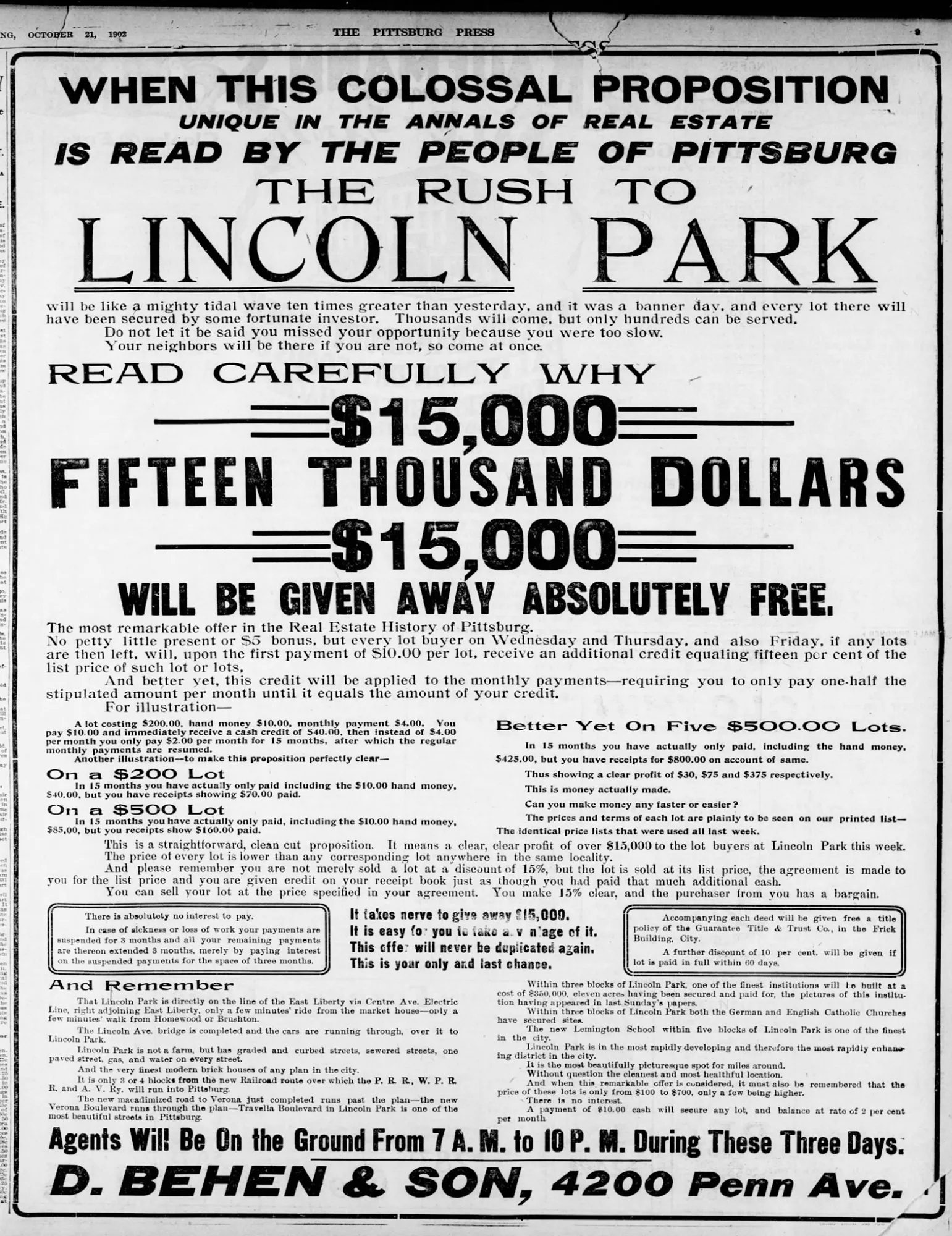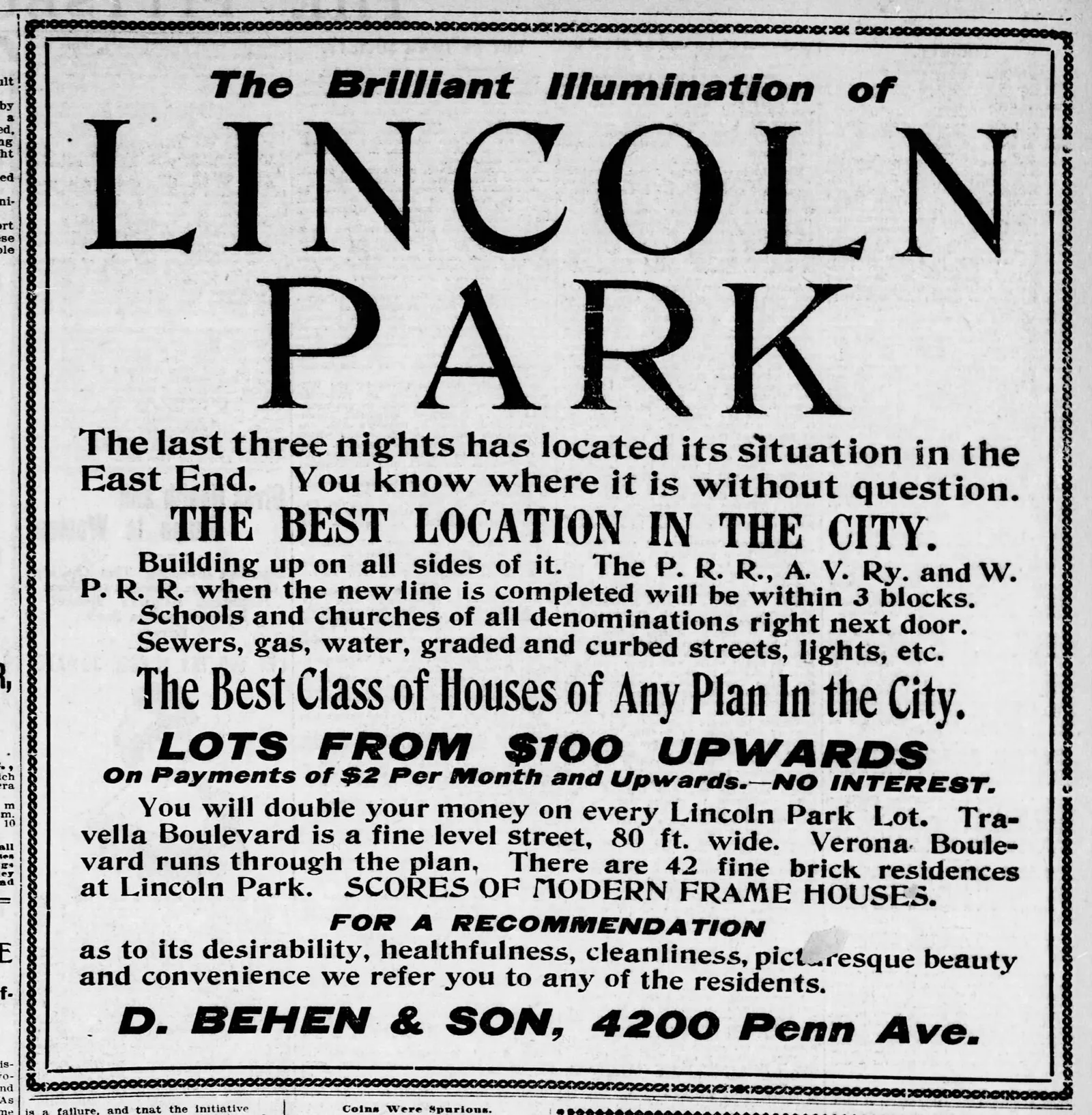 1902 advertisement from The Pittsburgh Press for Lincoln Park real estate