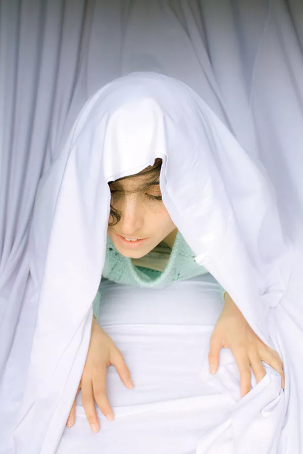 Via Craigslist, she sought people willing to host a week-long “performance” in their home, then connected with a Squirrel Hill family with two moms trying to expose their three kids to a broad range of art. One of the moms worked at CMU and was familiar enough with MFA artists to trust Sarnelle with a key and allow her to enter the home at random times. As the family went about its routine, Sarnelle silently blended into the fixtures, looking like a gymnast-ninja in a black leotard and facemask. “It was grown-up hide-and-seek,” she recalls. “Every day, they were like, ‘Where’s Nina?'” One day, she huddled on top of the refrigerator. On another, she stood behind a shower curtain. (Once family members spotted her feet, they “usually” detoured to another bathroom, she says.) For the duration of a dinner party, she quietly laid at the center of a table beneath a tablecloth.