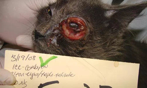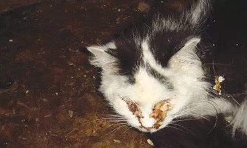 7 cats suffering from Mycoplasma conjunctivitis, deep corneal ulcerations, eye loss, and blindness