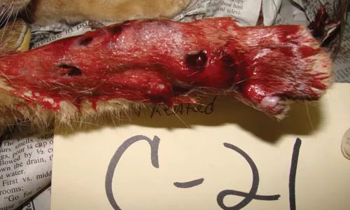 “The majority of the cats (71%) were under the age of three years old and 300 cats were found to be suffering from various degrees of malnutrition – 178 of those cats were emaciated and starving, and nearly 70% were dehydrated. 80% of the cats were found with upper respiratory infections, 73 with painfully inflamed eyes and 54 with painful mouths and tongue ulcerations. 53 cats suffered from an atypical and highly fatal Calicivirus infection (Virulent Systemic Calicivirus), that caused inflammation of blood vessels, severe swelling and wounds of the paws, and damage to internal organs, akin to the effects of Ebola virus. Rampant streptococcal diseases afflicted hundreds of felines, with 82 cats diagnosed with wounds and abscesses of the limbs and joints, over 68 cats with acute onset rhinitis (profuse amounts of pus coming out of their noses), and 51 cats who presented with spontaneously forming abscesses and wounds of their neck regions (referred to as Feline Strangles). Nine cats developed streptococcal meningitis when the infection destroyed the bones of their sinuses or extended via the inner ear to the brain and at least 28 cats had joints literally destroyed due to severely painful septic arthritis caused by the bacteria.”