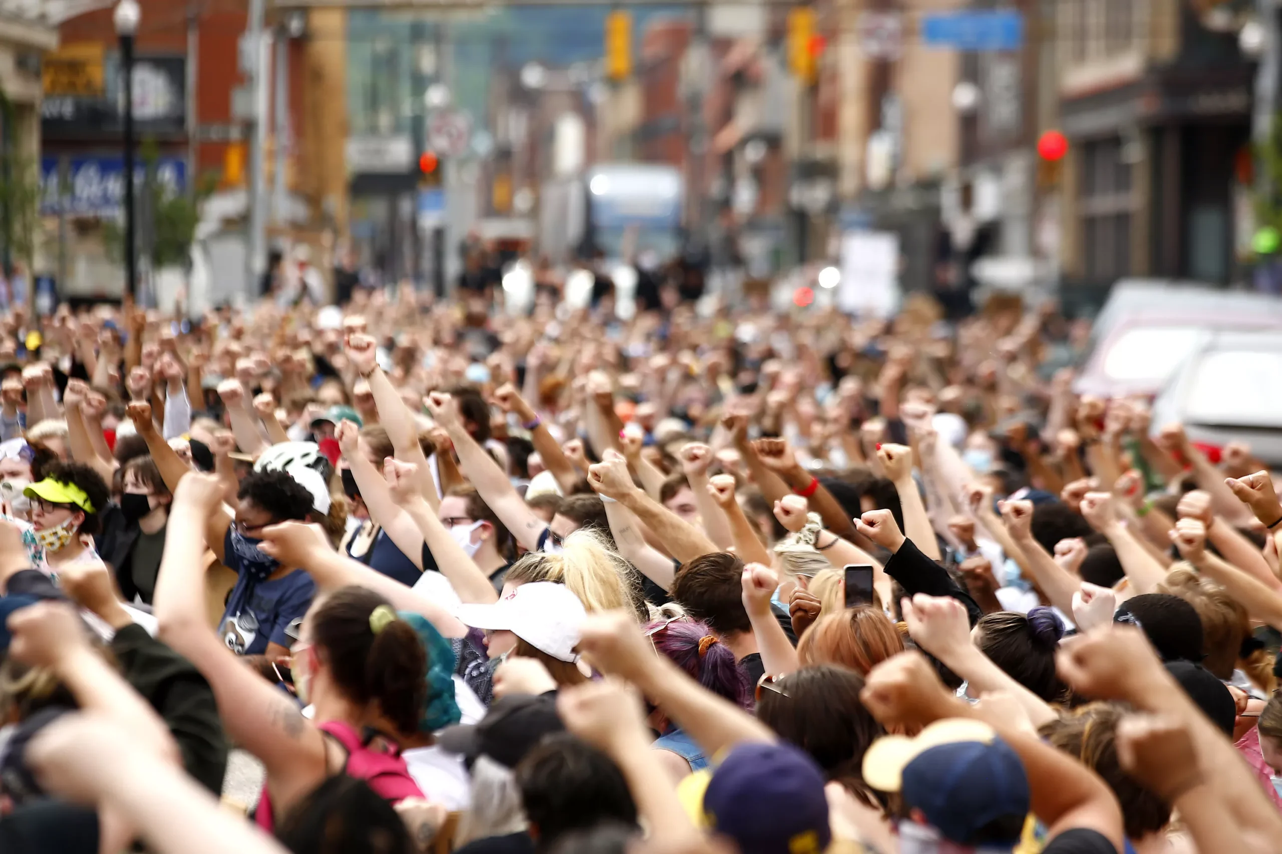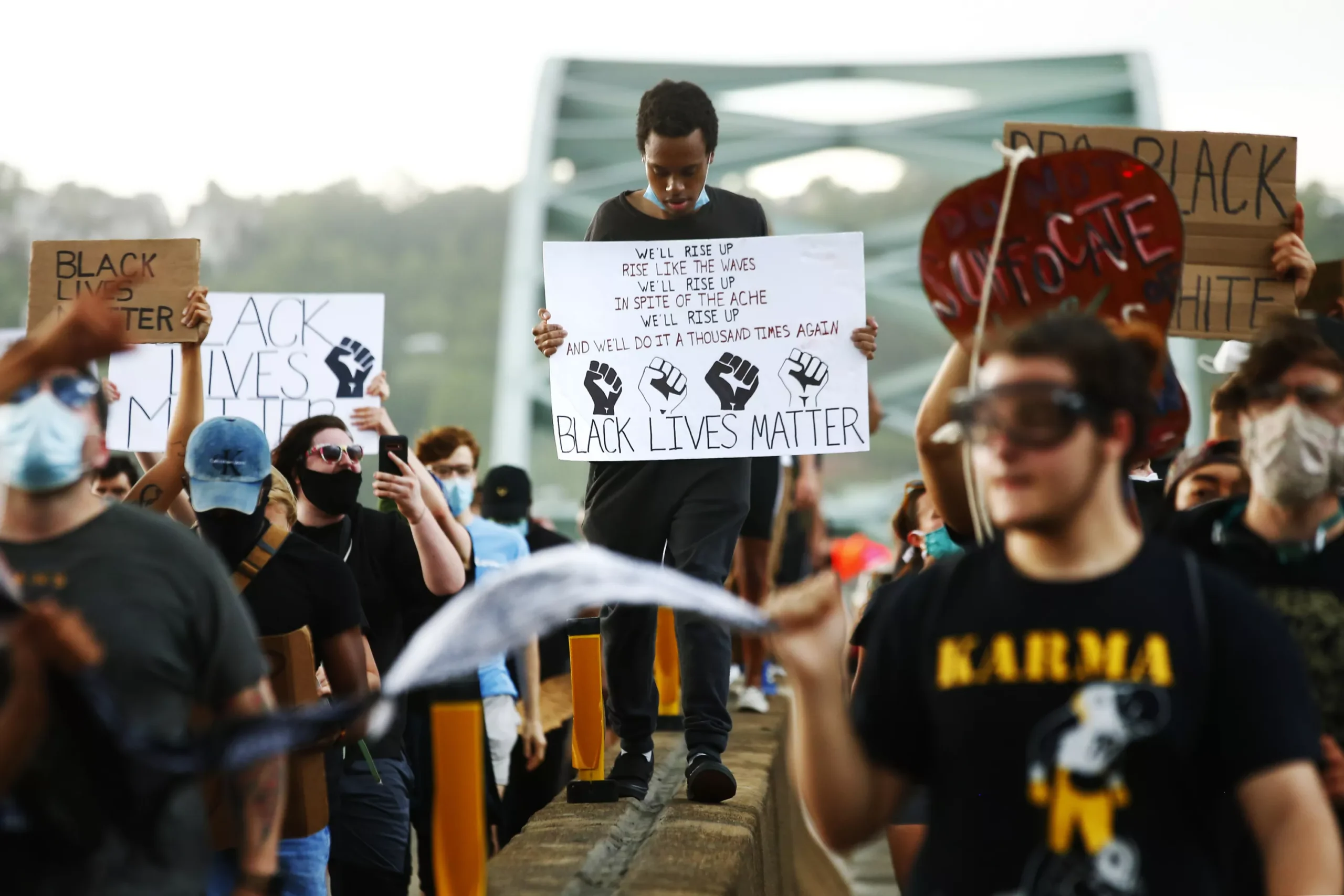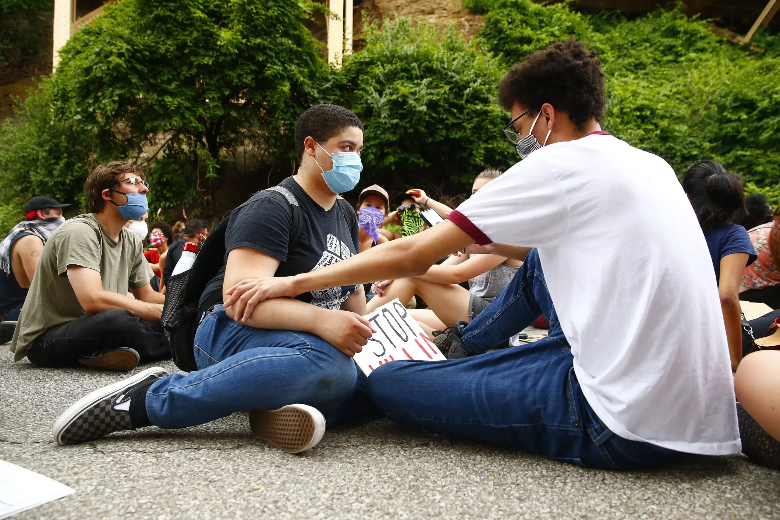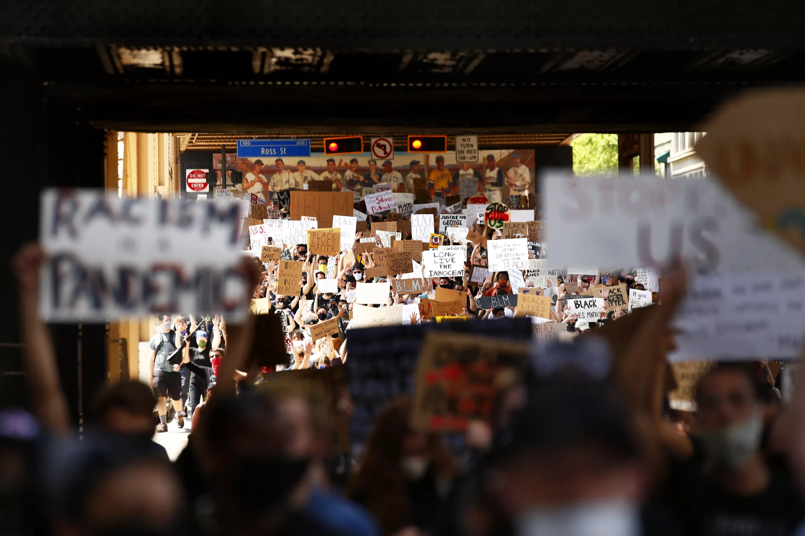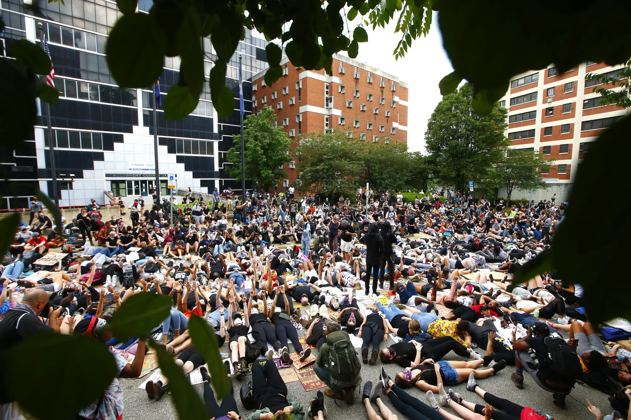 Starting in Downtown Pittsburgh in front of the Wood Street T Station, hundreds of peaceful protesters made their way to the Allegheny County Jail where they laid down on the ground with their signs, at times chanting; then, for eight minutes and 56 seconds, laid in silence. From there, they made their way across the 10th Street Bridge to the South Side and traveled down East Carson Street, stopping periodically to circle up and chant various names of Black people whose lives have been taken at the hands of police. One of the loudest chants, “Antwon Rose! Antwon Rose!” was called out as they sat at the corner of 18th and East Carson streets.