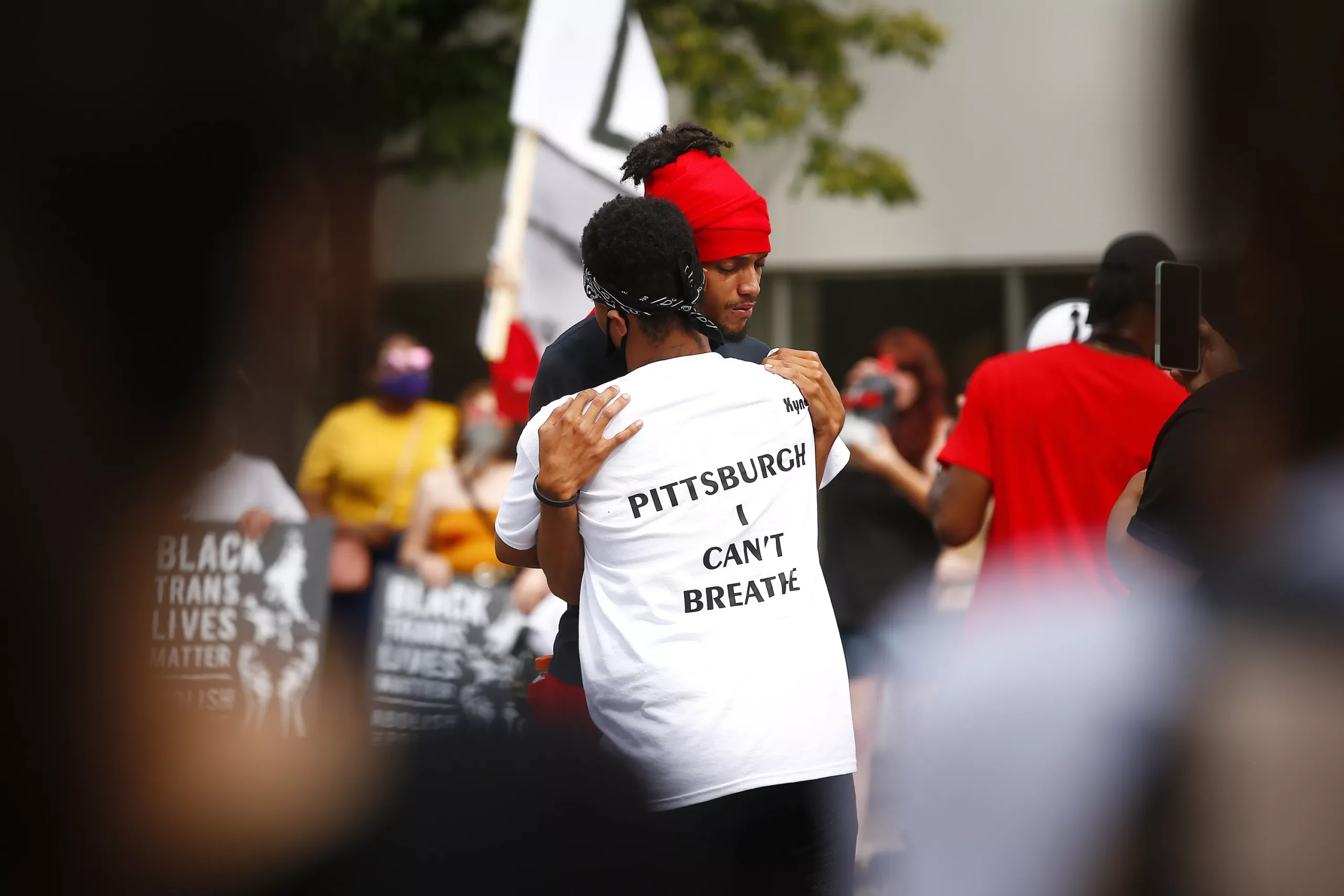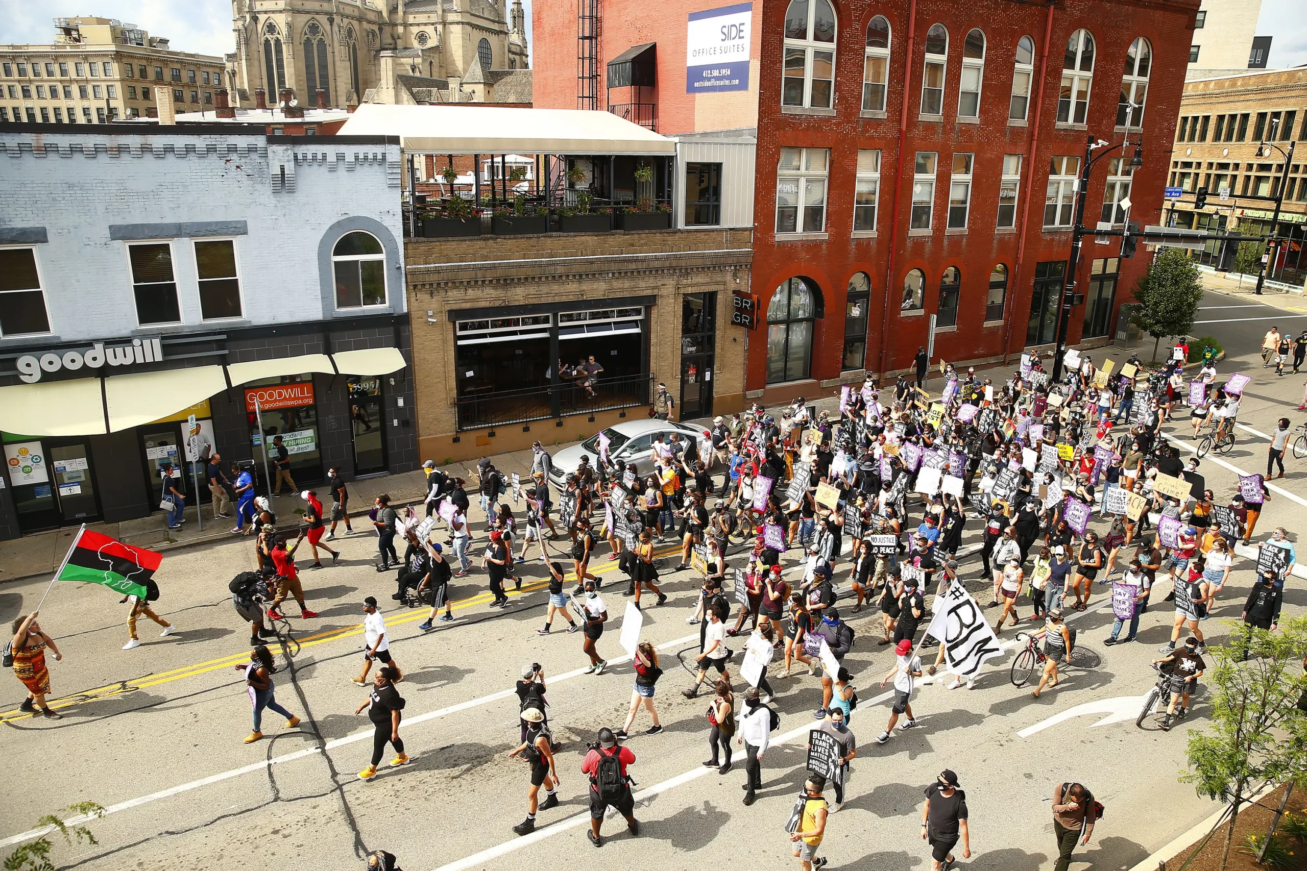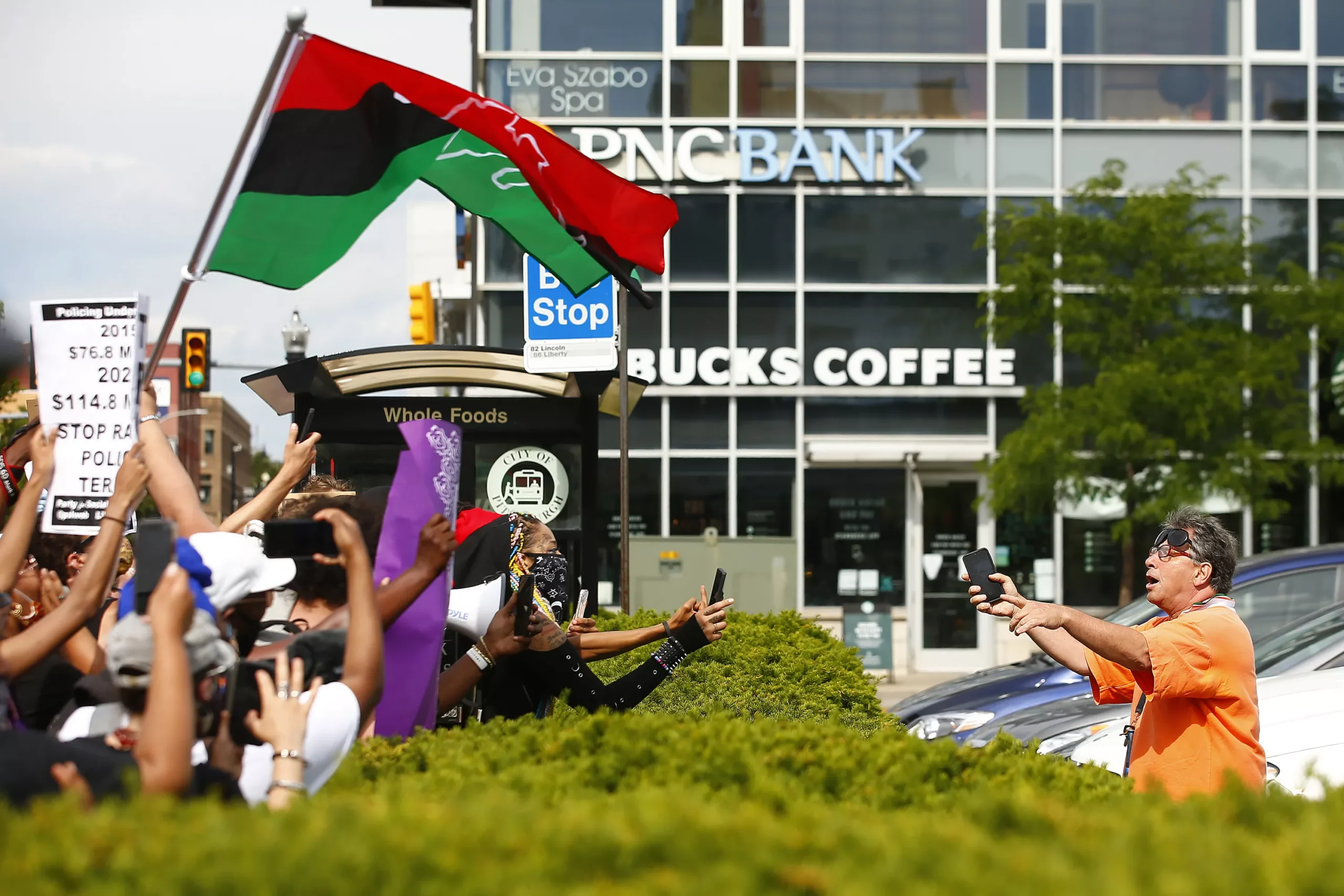 A large portion of today’s crowd of about 200 people raised their hands when asked if they were present on June 1 in East Liberty for a demonstration that started peacefully and ended with Pittsburgh Police and SWAT lining up in riot gear before launching tear gas and rubber bullets at protesters near the intersection of Centre and Negley avenues. Today, the march from Target to the same intersection had only a few police officers redirecting traffic from their motorcycles nearby. It was still triggering, however, for some people in attendance, including Lorenzo Rulli, who was hit with tear gas on June 1 (as were a number of nearby journalists, including myself). The group, organized by Pittsburgh I Can’t Breathe, chanted “Lorenzo Rulli was a freedom fighter and he taught us how to fight …” to lift his spirits following an emotional moment.