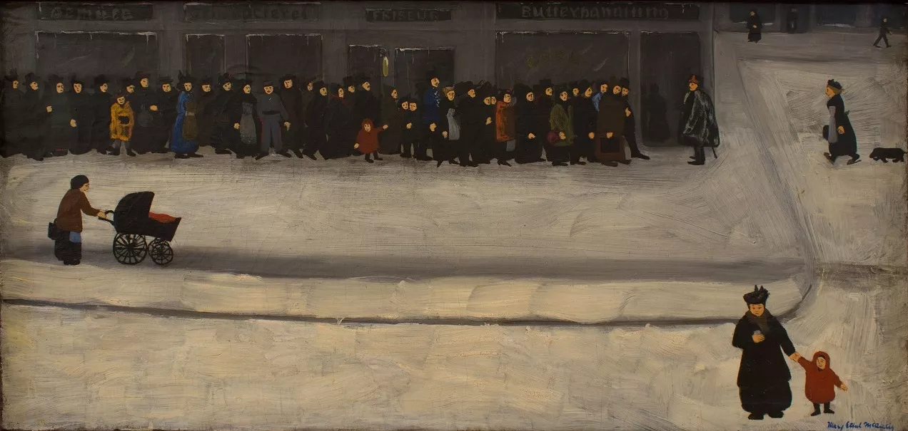 The show includes 10 paintings, on loan from collectors Rebecca and Tasso Spanos, depicting life in Germany during the First World War, and capturing “the nuances of quotidian life” in the country at that time. This includes scenes of women building train lines and shoveling coal, and mothers and children alone on the streets while male relatives were on the front line.