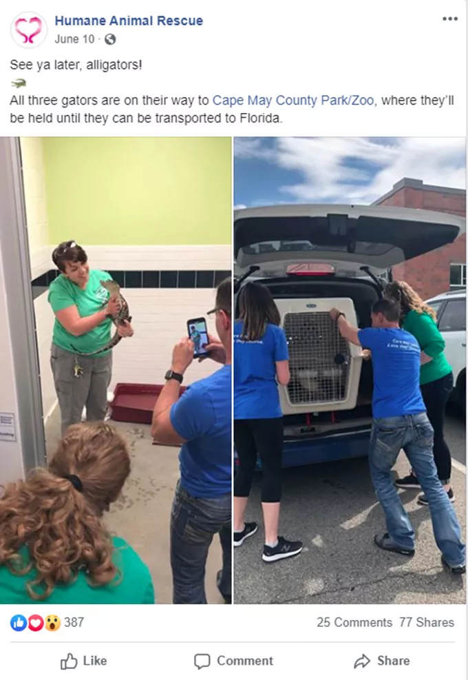 While the Humane Animal Rescue will house the alligators brought to them by Animal Control, they deal mostly with dogs, cats, and other common domestic animals. Their facilities and staff are not built to handle an alligator, let alone seven. So once they have the gators, they start working on transferring them to a sanctuary that is better equipped. In the most recent gator transfer, the alligators were first transported to Cape May County Park & Zoo in New Jersey, where they waited to be picked up by Croc Encounters, a conservation and education facility for alligators, crocodiles, and other animals in Tampa, Fla.