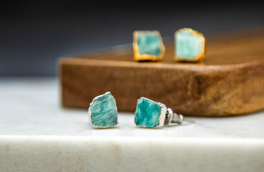 My most popular items are my raw stone studs, orbit earrings, and my whisper necklaces. My studs come in a variety of stone and color options so there is pretty much a stud that will fit anyone’s style. They are also the perfect size which makes them great everyday earrings. They come in burnt copper, 14k gold, and rhodium.