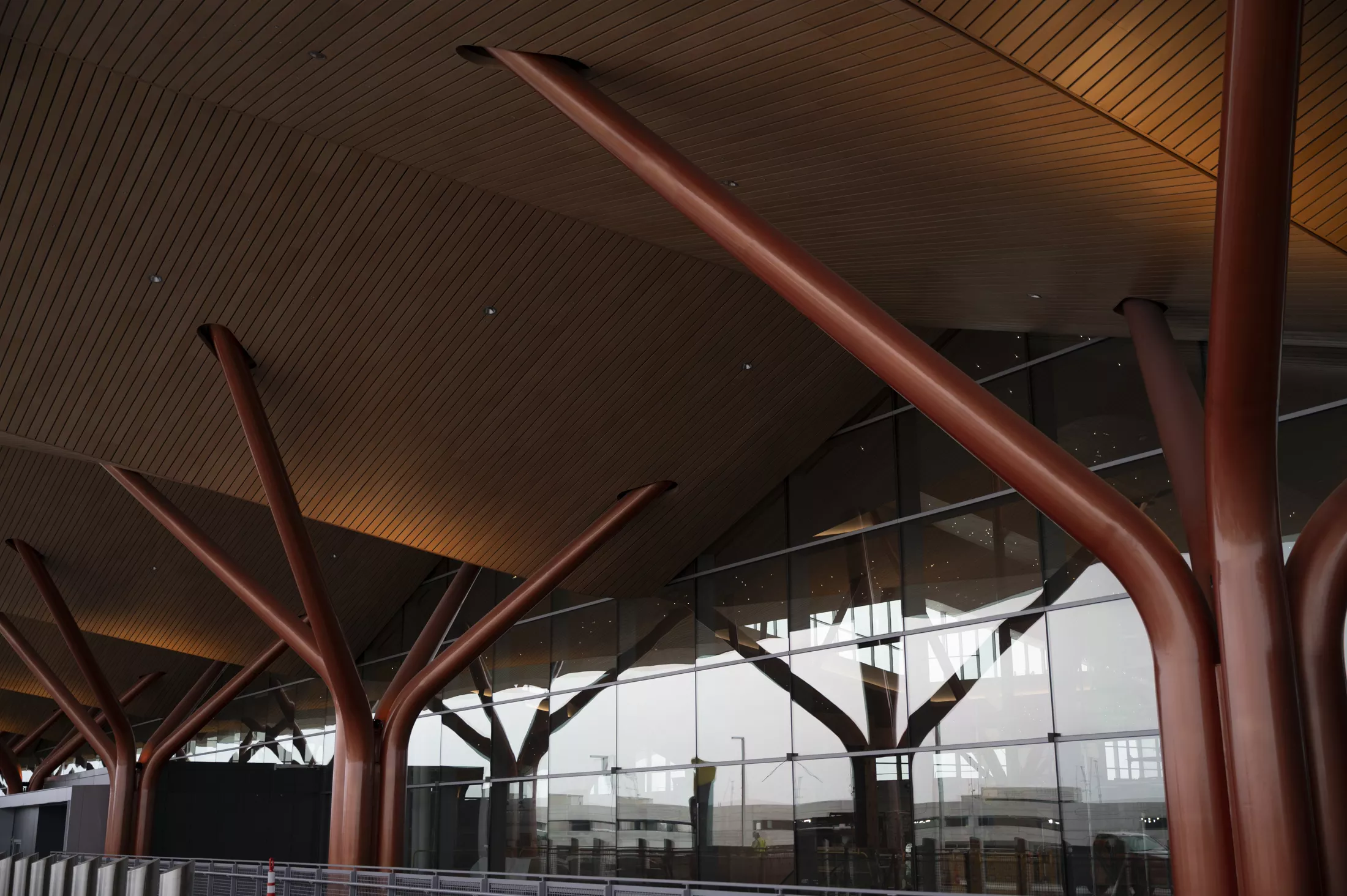 “We came up with this very, very quiet, almost invisible, little intervention here that lifts up the idea that these columns look an awful lot like trees that are upholding this wonderful wooden roof,” Merrell said. “And so, underneath 12 of these giant columns in the terminal, there are 12 different species of tree leaves that have sort of sprinkled down onto the floor.”