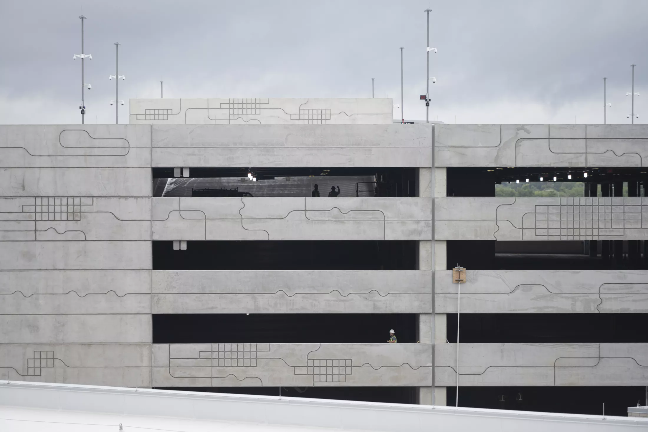 Zigzagging lines resembling a transit map cover a large parking deck