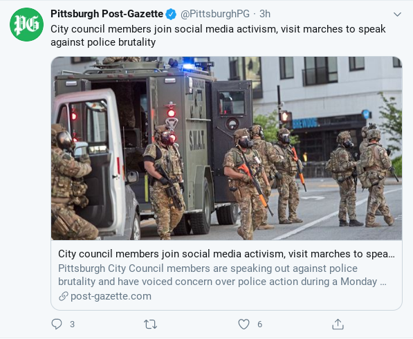 There was coverage related to the protests still up on P-G’s site today. But it is a story focused on the criminal charges levied against the 20-year-old Shaler man who allegedly started initiating the damage of a police vehicle during the protest on May 30.