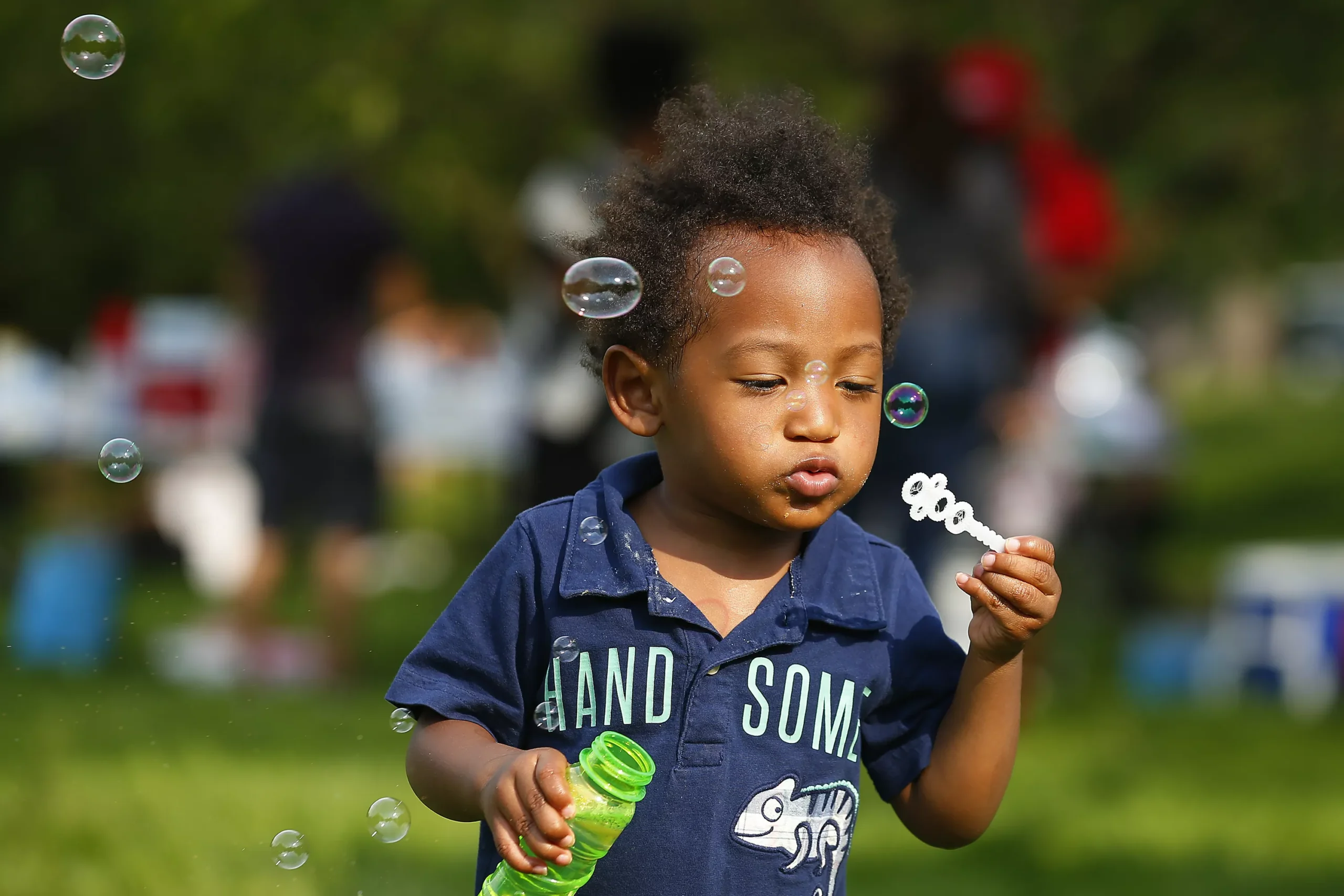 Malo, 1, blows bubbles before the start of the protest. Credit: CP Photo: Jared Wickerham