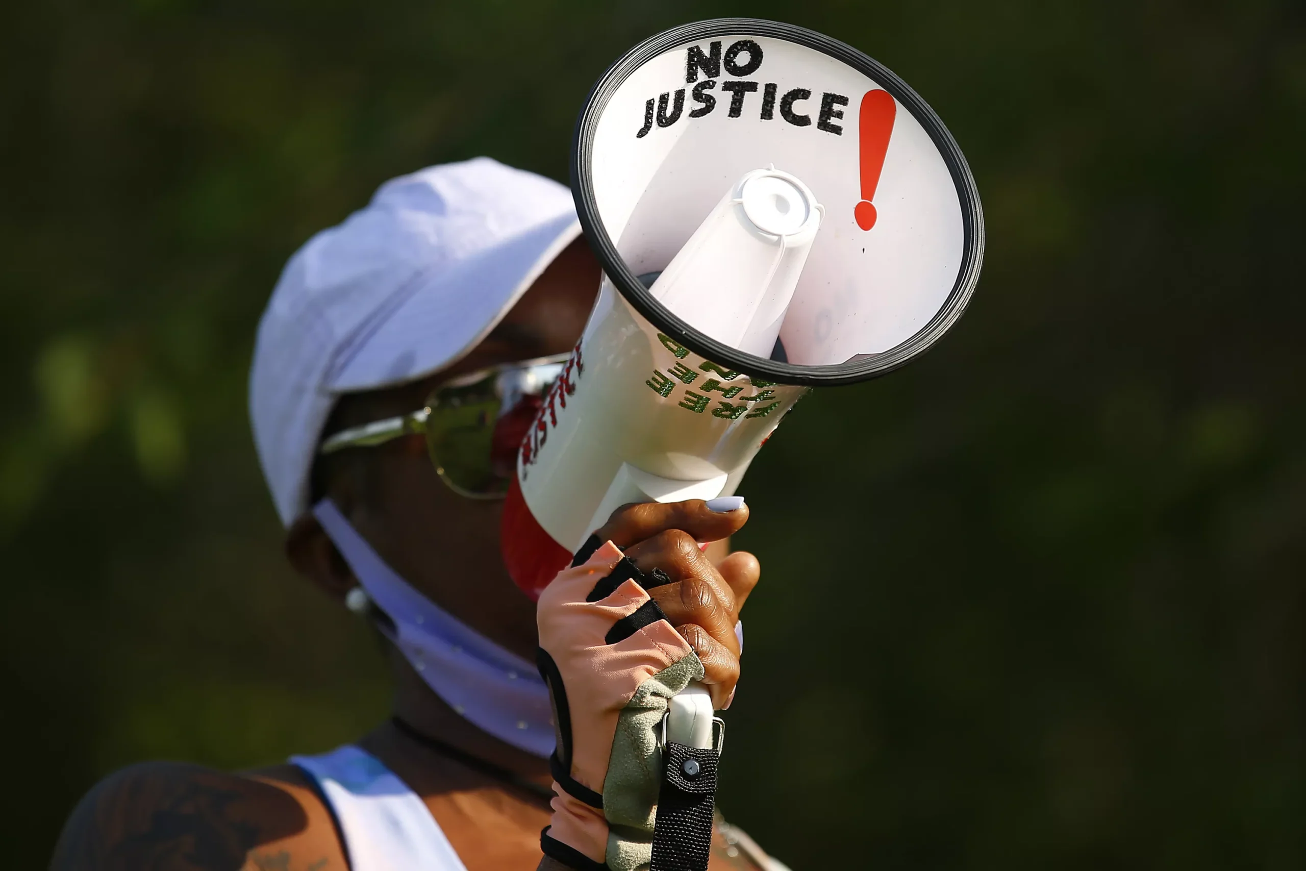 Ikhana-hal-nakina wears a shirt remembering her brother and friend who were killed by police. Credit: CP Photo: Jared Wickerham