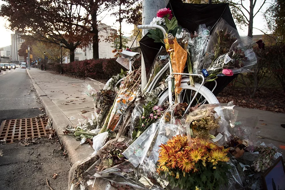 Anna Tang of advocacy group Bike Pittsburgh organized the memorial and moment of silence, which were held at the Susan Hicks “ghost bike” site near the intersection of Forbes and Bellefield avenues in Oakland. Hicks was killed in 2015 while riding her bike on Forbes Avenue, after being struck and pinned between vehicles. A proposed bill to allow for more parking-protected bike lanes across Pennsylvania has been named after Hicks.