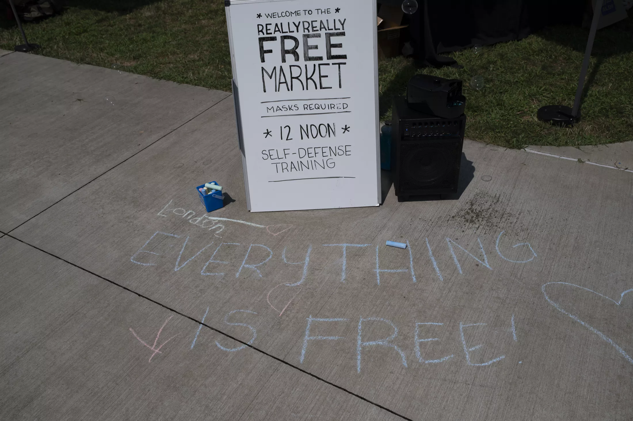 A sandwich board advertising the RRFM near a chalk drawing assuring visitors everything is free