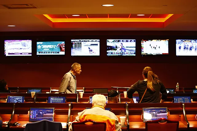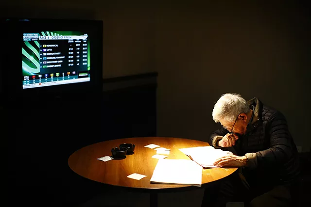Heading down to the track, I was treated to the ultimate pump-up music: Smash Mouth’s “Then the Morning Comes,” which was preceded by k.d. lang’s “Constant Cravings,” an appropriate tune for the compulsive gambler. When I got to the track’s betting room, which is comparable in decor to a MedExpress, I was greeted by 40 or so gray-haired men wearing winter coats despite it being 70 degrees outside. While none of them were there together, everyone seemed to know one another, trading head nods and occasional handshakes. They were scattered throughout the main floor, at tables, and at rows of desks outfitted with banker’s lamps that resembled a college library. But instead of studying Proust, they were scrutinizing $2 programs and the 20 or so screens simulcasting races. It seemed to be much more business than pleasure with far more analysis than socializing.