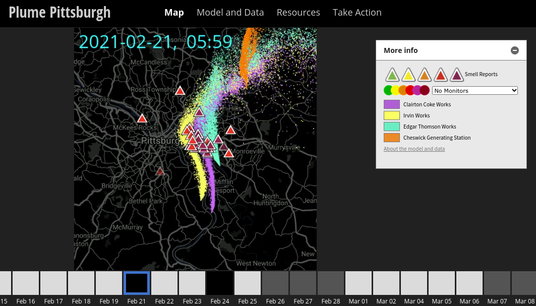 “The alignment of these independent data sources can help us understand whose health may be impacted by this industrial pollution,” said Randy Sargent of CREATE Lab in the online post. “The PlumePGH website lets you explore across time and find how pollution moved on any given day. You can explore smell reports and modeled pollution and add a variety of air quality monitoring data to the map as you engage in this effort to hold these industries accountable.”
