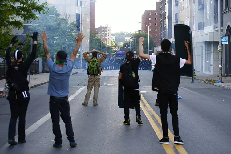 After the three-hour march concluded, several protest organizers called on people to disperse and return home. That is when a group of about 100 continued to march from Target and down Centre Avenue. After they were confronted by police, the crowd retreated back toward the Home Depot in East Liberty. By the time curfew came at 8:30 p.m., most of the crowd had completely dispersed and protesters headed home. Police on horseback, in vehicles, and on foot in riot gear swept through the East Liberty business district. According to news reports, some people were arrested in East Liberty for violating curfew.