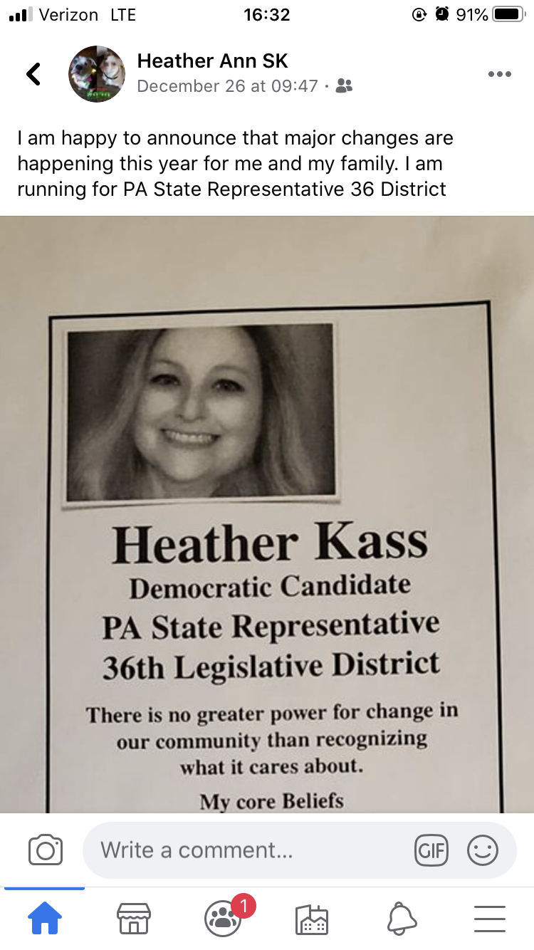 The post came from Facebook account Heather Ann SK, which appears to be Kass’ personal Facebook page. On Dec. 26, 2018, this same account shared a photo of a flyer announcing Kass’ race for state representative with the caption, “I am running for PA State Representative 36 District.” The image on the Kass flyer matches the image on Kass’ candidate Facebook page.