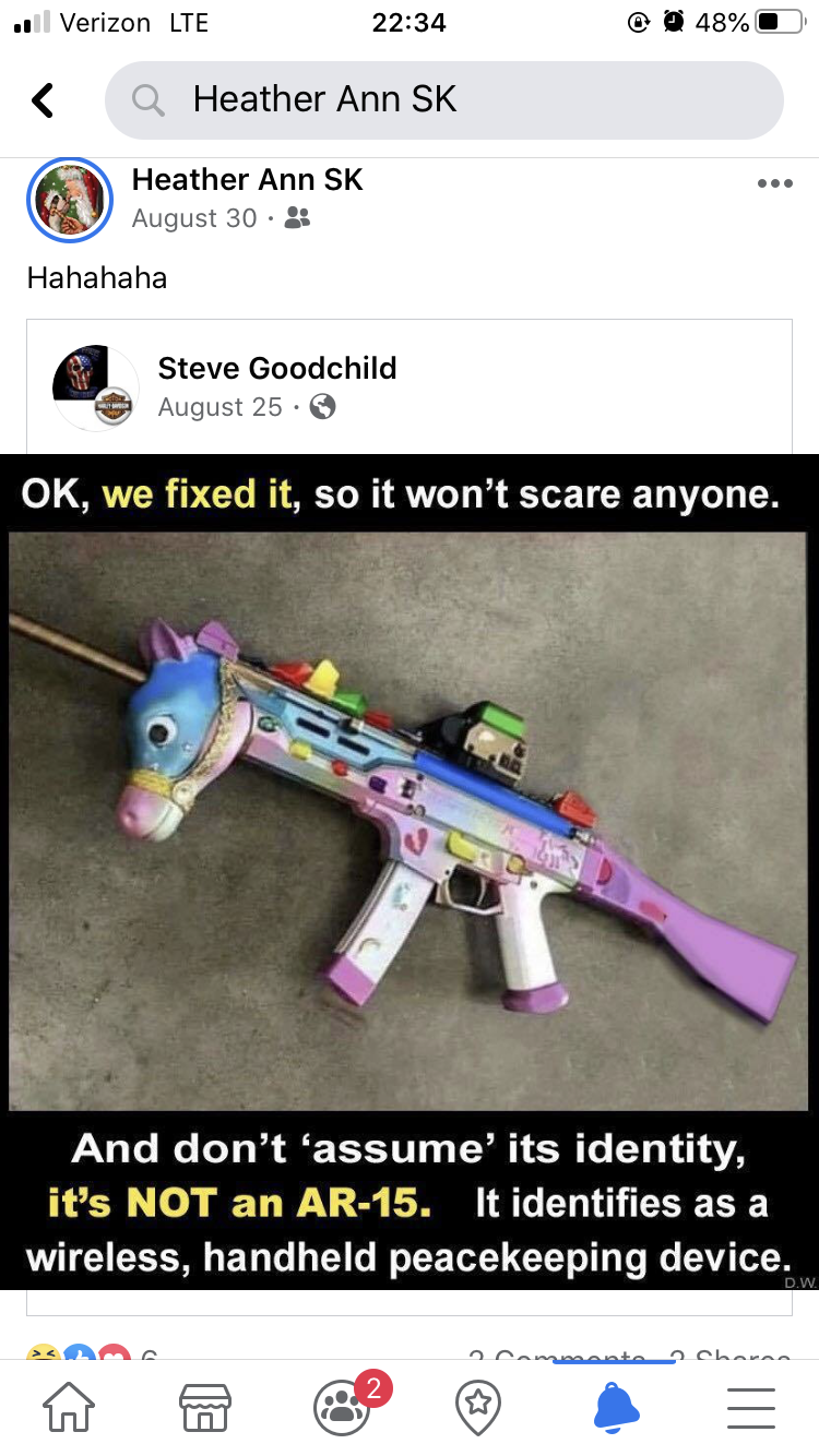 Another post shared by Heather Ann SK from last August shares a meme popular on conservative websites of a rifle dressed up as a unicorn, reading “OK, we fixed it, so it won’t scare anyone. And don’t ‘assume’ its identity, it’s NOT an AR-15. It identifies as a wireless, handheld peacekeeping device.”
