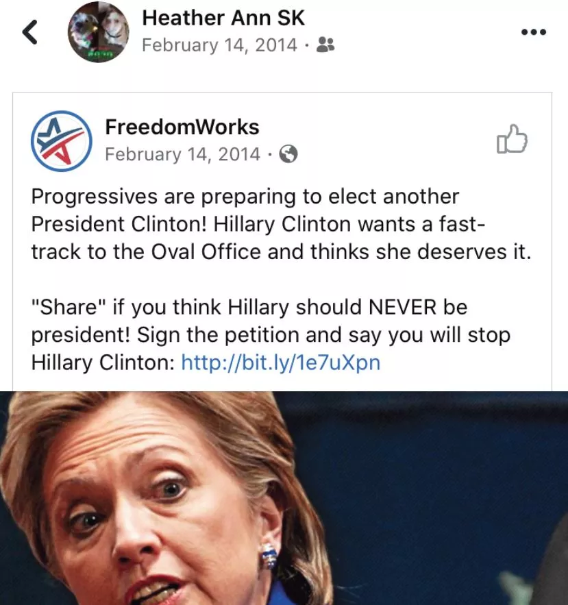 The Heather Ann SK account shared a post in 2014 from the right-wing group Freedom Works that asked people to share the post if they agree that Hillary Clinton should never be president. Freedom Works is funded by the Koch family.