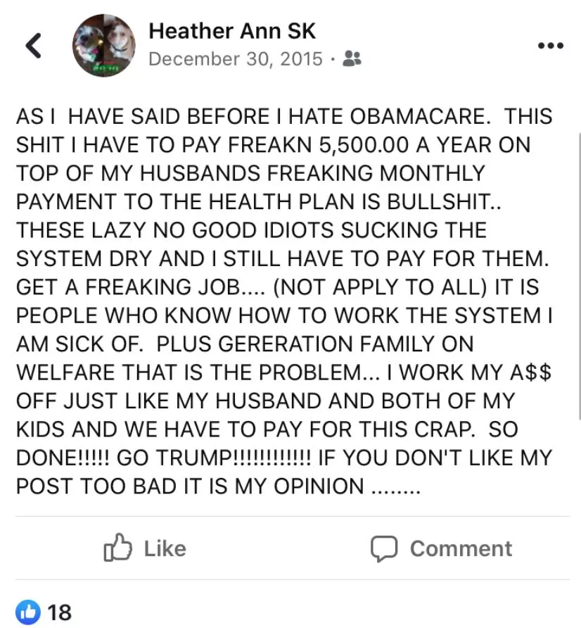 In December 2015, Kass wrote in all caps on her personal Facebook page that she hates Obamacare, complained about her premium payments, and decried, “THESE LAZY NO GOOD IDIOTS SUCKING THE SYSTEM DRY AND I STILL HAVE TO PAY FOR THEM.” At the end of the post, she wrote “GO TRUMP!!!!!!!!!!!!” with 12 exclamation points.