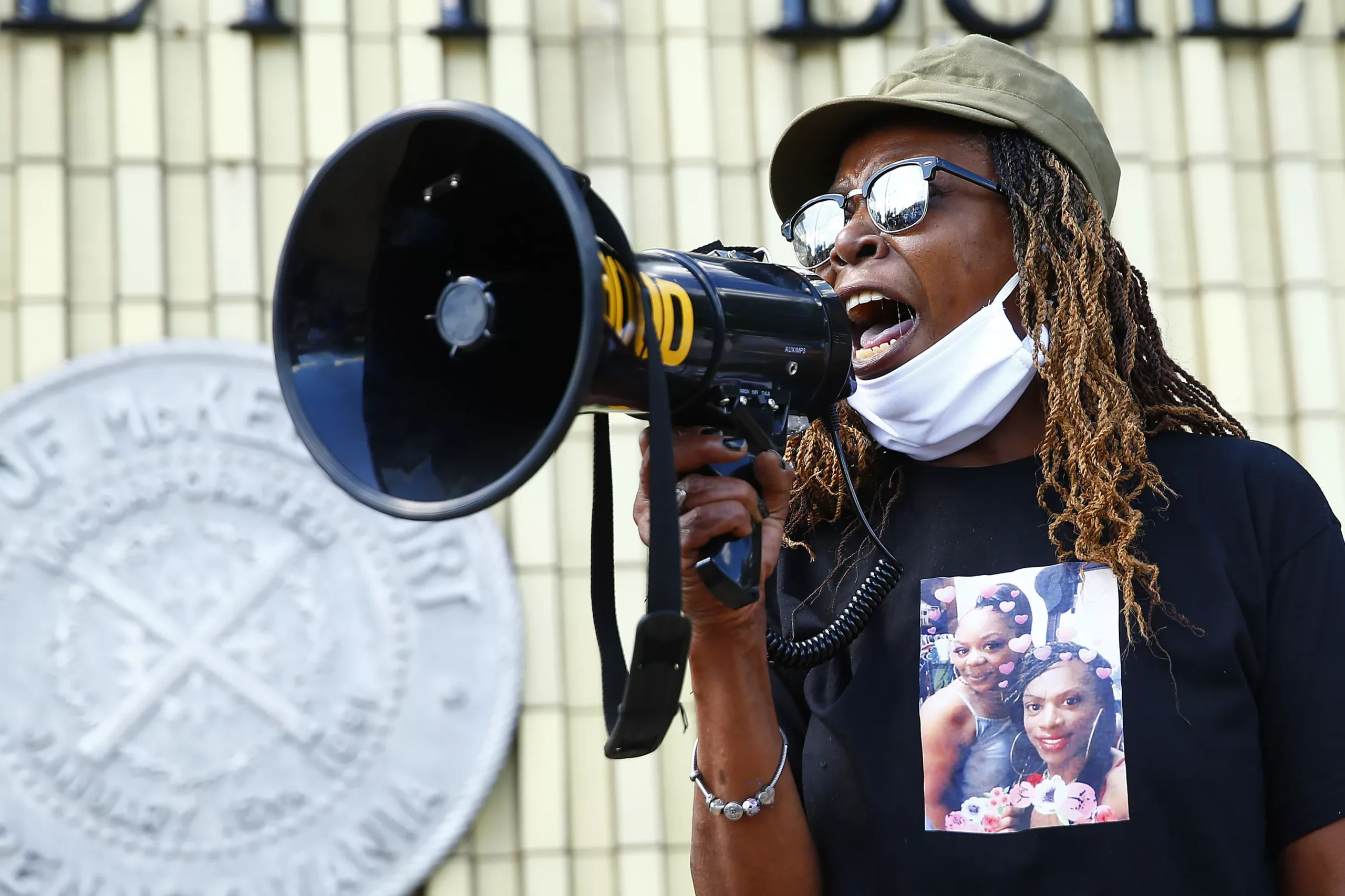 Tonya Reed, the mother of Aaliyah Johnson, screams for answers through the megaphone in front of the police station in downtown McKeesport. Credit: CP Photo: Jared Wickerham