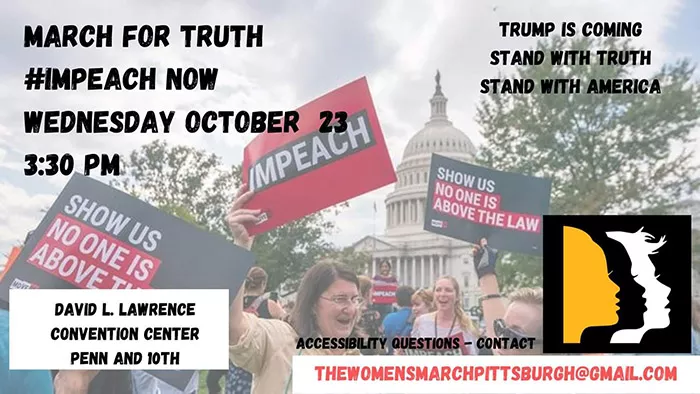 The Pittsburgh chapter of the Women’s March on Washington is joining with Indivisible Pittsburgh for a march calling for President Trump to be “impeached and removed” from office. Participants are encouraged to bring “signs supporting true American values of peace, liberty, and justice for all; an American or other flag to wave in support of those values; and a whistle to blow to thank those who are speaking out against the high crimes and misdemeanors of this administration.”