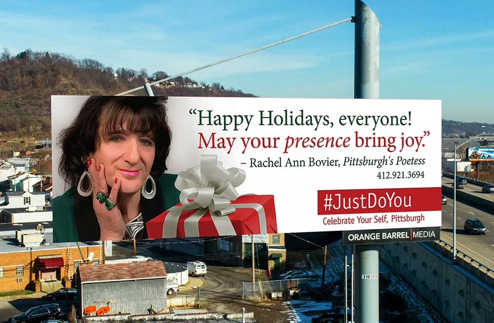 The city lost an eye-catching landmark when Pittsburgh’s self-proclaimed “poetess” Rachel Ann Bovier could no longer run her delightful, self-funded billboards along Bigelow Boulevard. Now drivers along Route 28 can see Bovier again thanks to new billboards from local advertising and marketing agency, BOOM Creative.