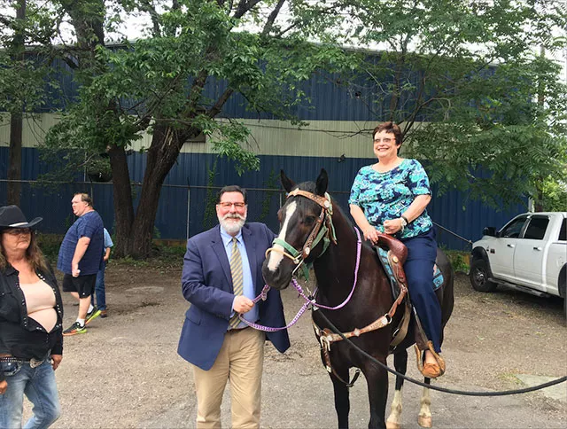 Put a politician on a horse for a publicity event and the jokes seem to write themselves. Outgoing North Side City Councilor Darlene Harris was a good sport when she actually got in the saddle, with some apparent hesitation, on one of six horses present at a June 12 ribbon cutting. The project involves the renovation and addition to a historic building at 836 West North Avenue in the Allegheny West neighborhood.