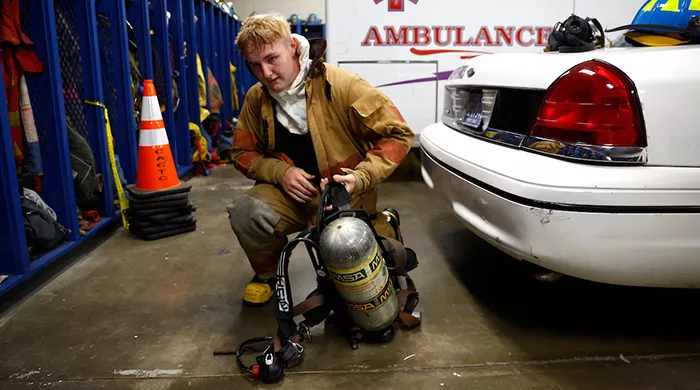 Connellsville Area Career & Technical Center student Garrett Shearer in the Protective Services program removes his firefighting uniform inside the classroom. Credit: CP Photo: Jared Wickerham