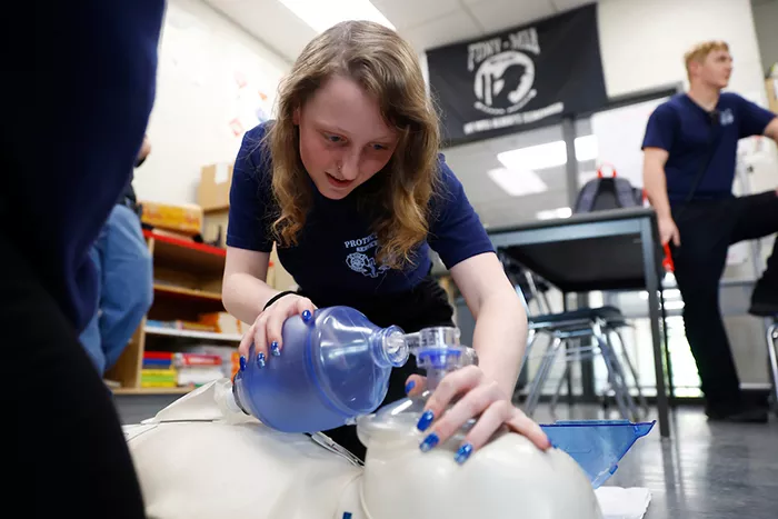 Connellsville Area Career & Technical Center student Hannah Upton runs through a mock scenario as part of the Protective Services program inside the classroom. Credit: CP Photo: Jared Wickerham