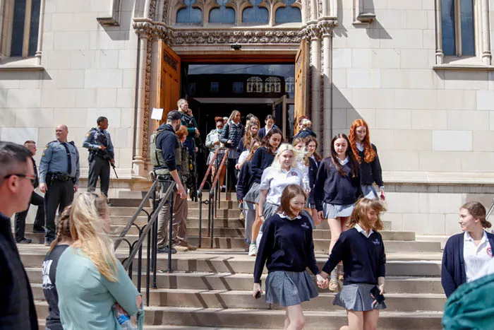 Oakland Catholic High School students exit lockdown from St. Paul’s Cathedral past parents, news cameras, and police officials. -