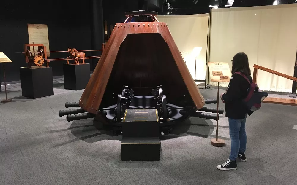 While Da Vinci is most noted for his famous flying machines, as well as works such as the Mona Lisa and The Vitruvian Man (all of which are included here), the exhibit showcases just how far his reach extended. Besides aviation and art, he also contributed discoveries in the fields of engineering, hydraulics, and warfare, demonstrated here with the incredible addition of his early design for an armored tank.
