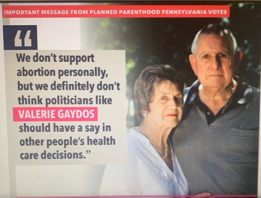 This includes an election mailer sent out to supporters that appeared to stigmatize abortion. A document provided to CP shows a man and woman accompanied by the text, “We don’t support abortion personally, but we definitely don’t think Valerie Gaydos should have a say in other people’s health care decisions,” referring to local state Rep. Valerie Gaydos (R-Aleppo).
