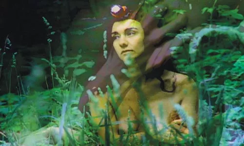 “The need to wash the self with milk and honey” depicts a naked woman, wearing a sort of jeweled headpiece in her long, dark hair, walking through a lush forest and carrying a pail in each hand. Accompanied by a lyrical voiceover, she sits down to bathe. The woman is portrayed by Loyola-Garcia herself, an internationally exhibited artist and instructor in the Robert Morris University media-arts program. She has described the dreamily paced work as “a ritualistic performance of spirituality” and an “act of healing and validation.”