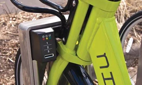 Here’s how it works. Somebody buys a bunch of bikes and electronically locking stations — dozens or more stations around town — to store them. To rent a bike, swipe your credit card; the first half-hour is free, and a 24-hour rental might cost $5. When done, return the bike to any station.