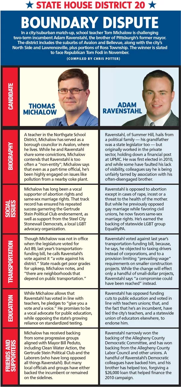 In a city/suburban match-up, school teacher Tom Michalow is challenging two-term incumbent Adam Ravenstahl, the brother of Pittsburgh’s former mayor. The district includes the suburbs of Avalon and Bellevue, along with the city’s North Side and Lawrenceville, plus portions of Ross Township. The winner is slated to face Republican Tom Fodi in November.