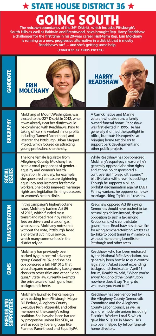 The redrawn boundaries of the 36th District, which includes Pittsburgh’s South Hills as well as Baldwin and Brentwood, have brought Rep. Harry Readshaw a challenger for the first time in his 20-year career. First-term Rep. Erin Molchany is running as a new, progressive alternative in a district that is mostly Readshaw’s turf … and she’s getting some help.