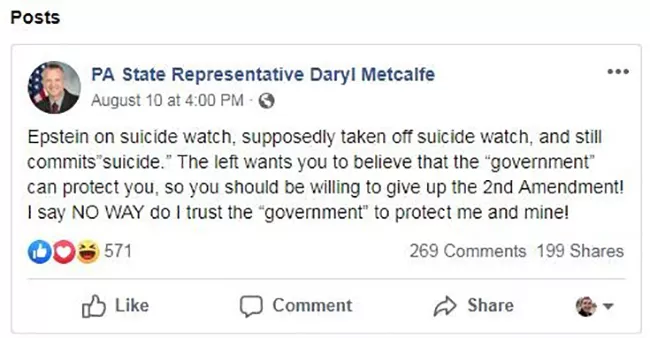 On Aug. 10, just hours after news reports revealed Epstein’s death, Metcalfe indicated on Facebook that he didn’t believe Epstein died of suicide, and then implied the government isn’t legitimate and shouldn’t be trusted.